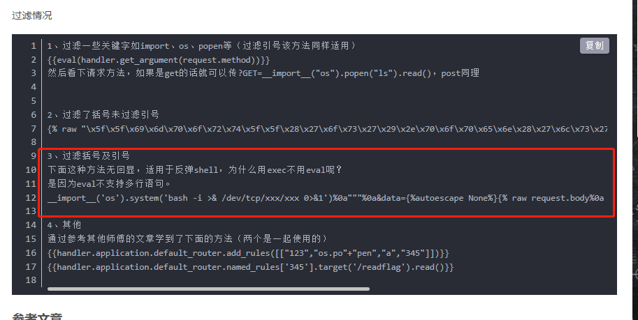 eval,而前面的'print(123)'是eval的参数,那么我们从别处接收到参数,即可绕过小括号的限制。在文章的中间讲了