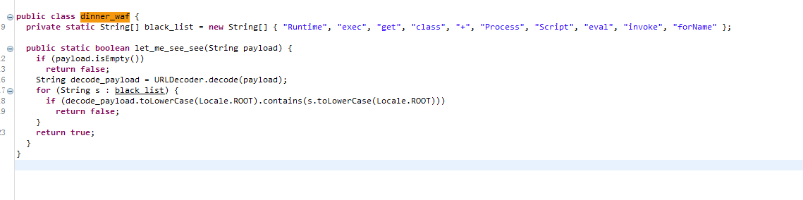 dinner_waf.let_me_see_see方法,可以看到waf。可以看到,在检测waf前,会对payload进行一次url解码。尝试用