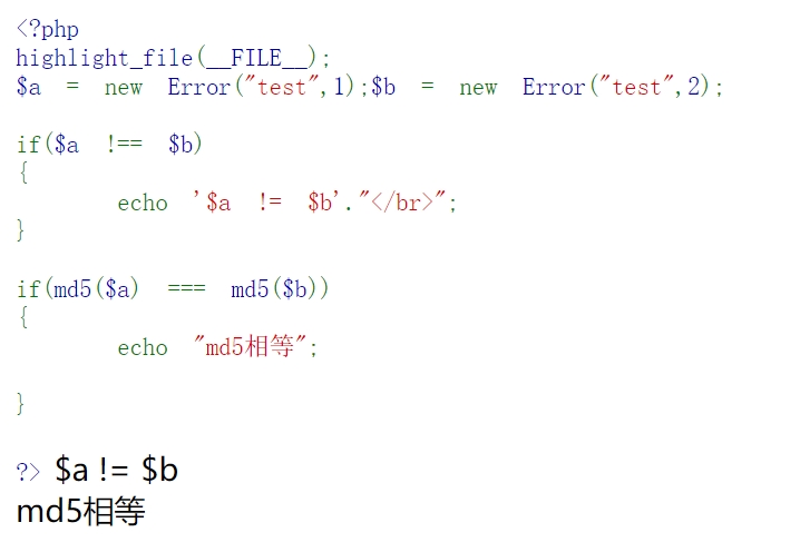 Error可以传两个参数,有个参数值的不同则对象不同也就不相等,但对由于__toString()返回的值相同md5和sha1加密后也相同,最后得到的数据也是一样的,所以可以达到hash绕过。