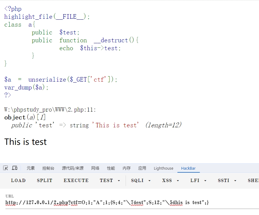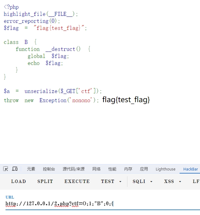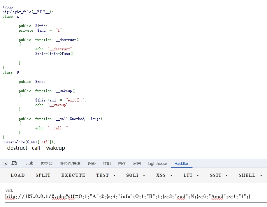 这时我们将键名b改成a,即在反序列化时,会下先让a赋值为类B,之后再将a赋值为NULL,但一开始a已经是对象了,赋值为NULL时就会出现对象为NULL的情况,从而触发__destruct。
