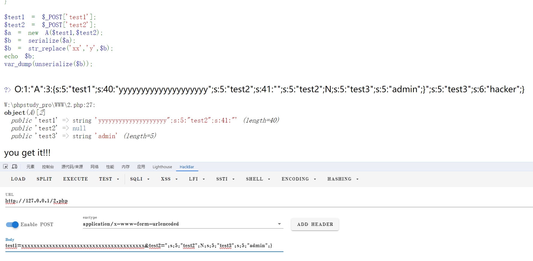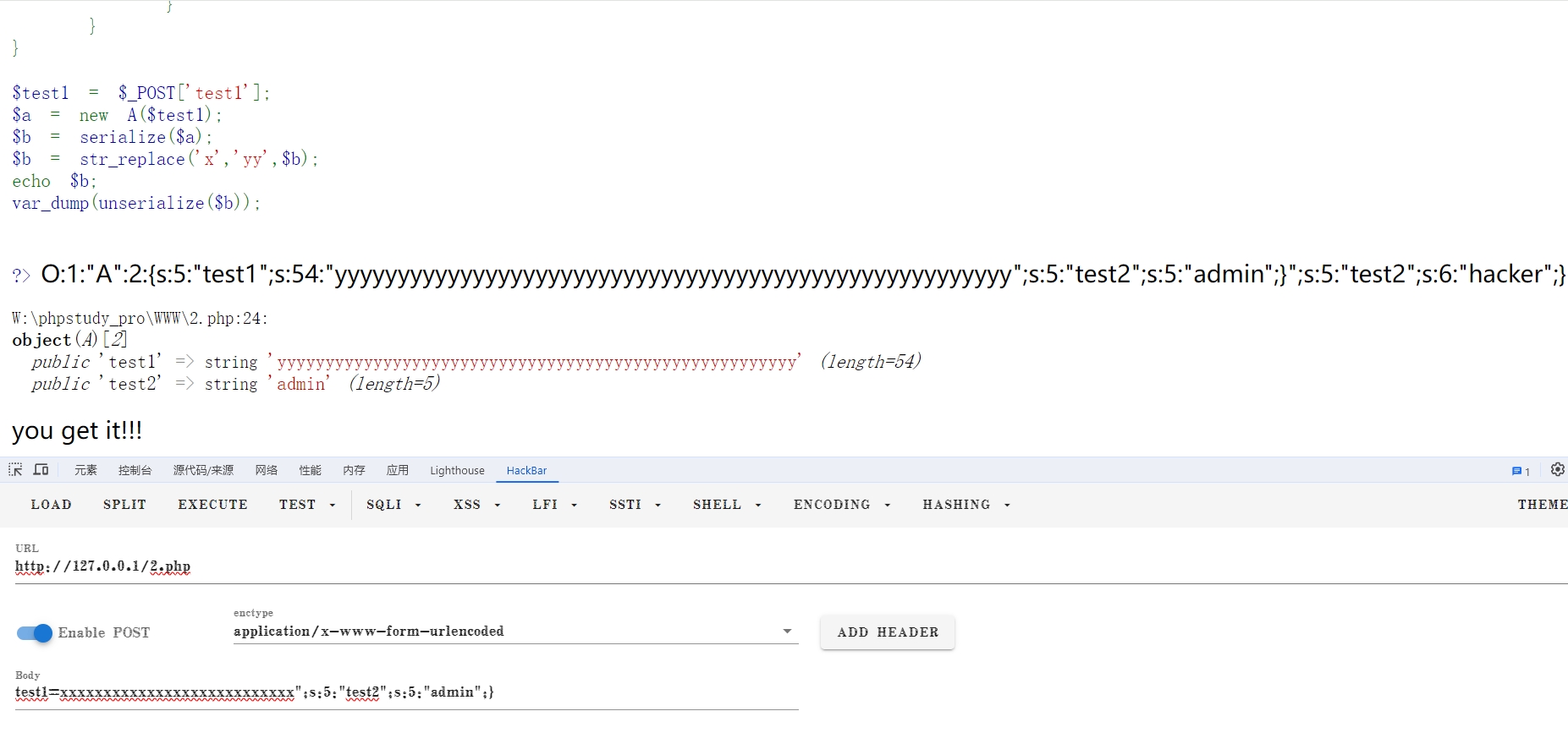 O:1:"A":3:{s:5:"test1";s:6:"xxxxxx";s:5:"test2";s:3:"abc";s:5:"test3";s:6:"hacker";} - 经过替换后,变成