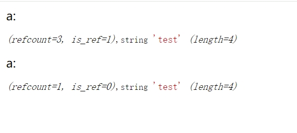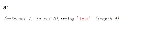 这里定义了一个变量 $a,生成了类型为 String 和值为 test 的变量容器,而对于两个额外的字节,is_ref 和 refcount,我们这里可以看到是不存在引用的,所以 is_ref 的值应该是 false,而 refcount 是表示变量个数的,那么这里就应该是1,验证一下。